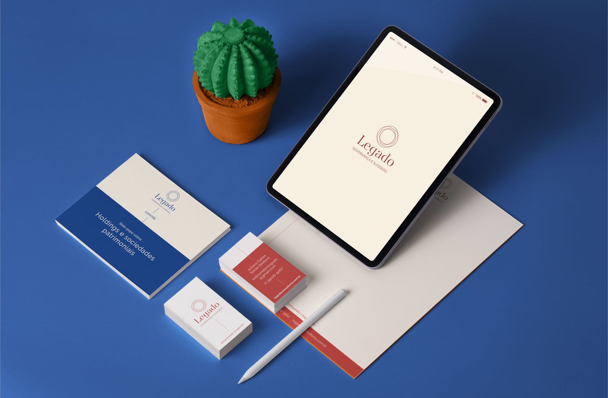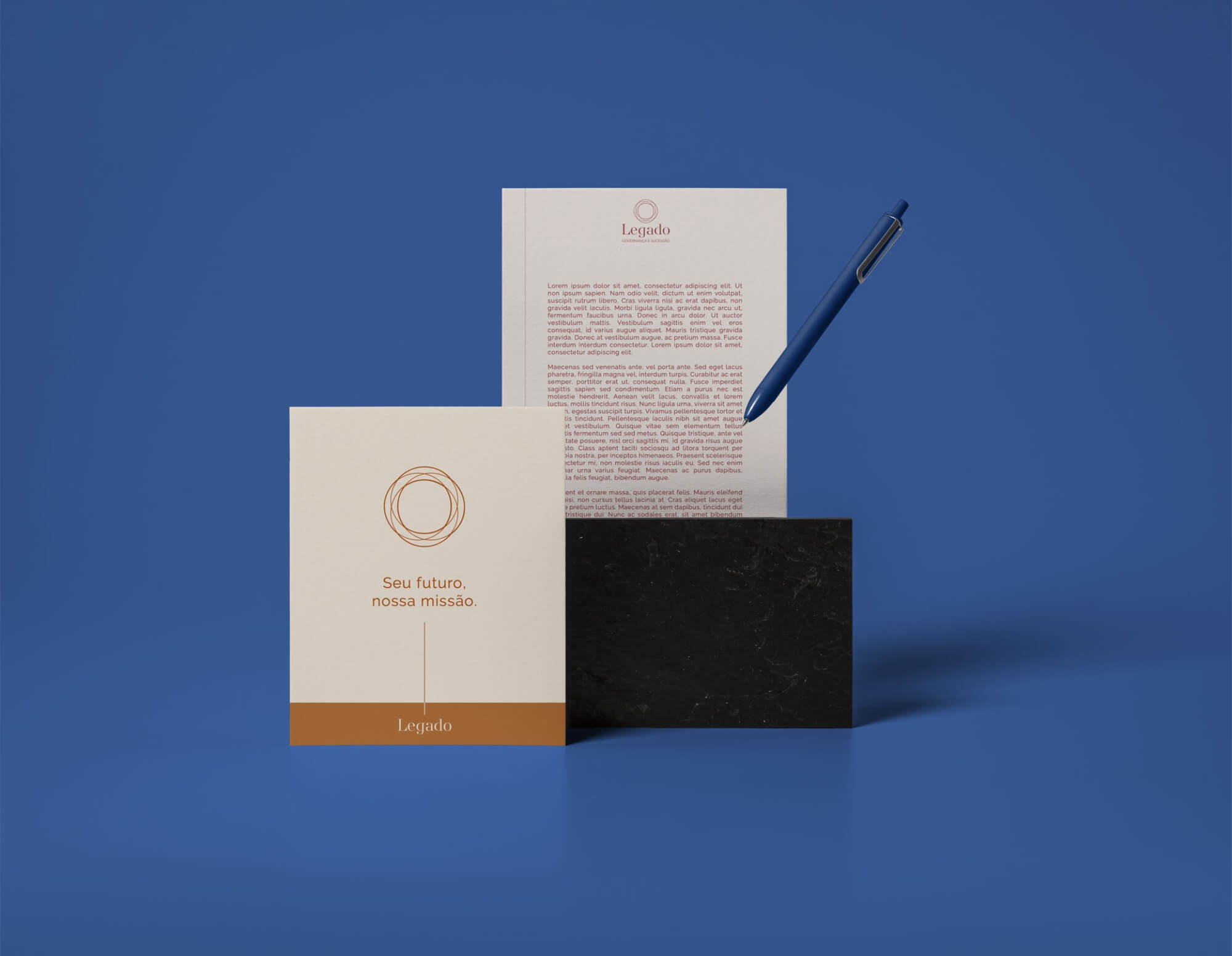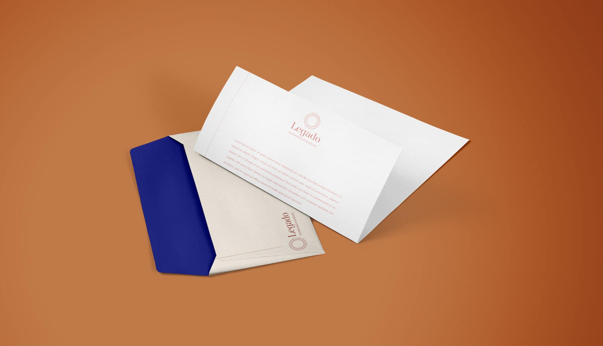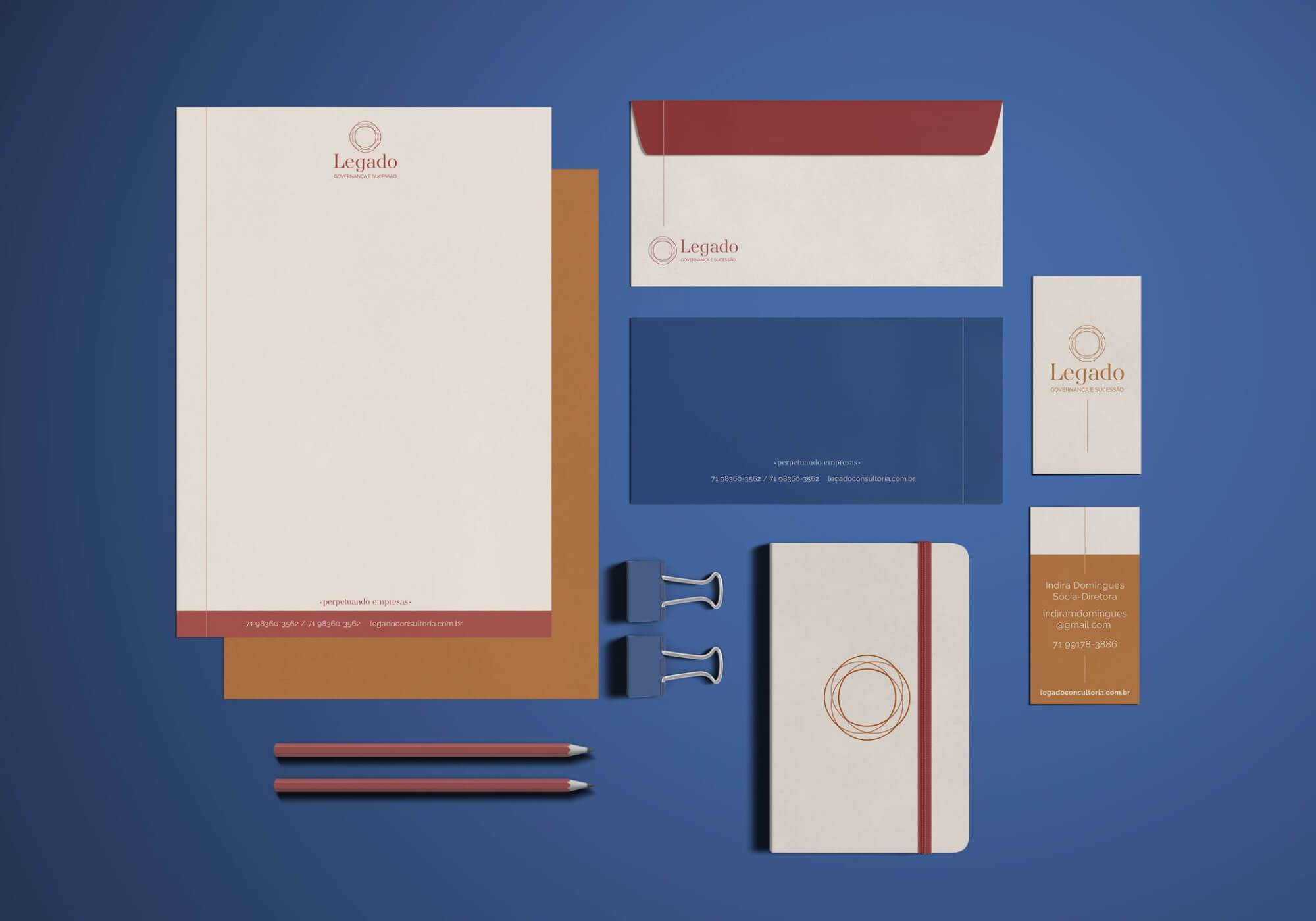 Criamos para a Legado uma marca que traduz a essência das sócias, partindo do mesmo conceito da marca anterior, o símbolo Enso, que representa a busca constante pela perfeição. O novo desenho traz uma sofisticação à marca, utilizando de um fio delicado que se entrelaça, de modo a mostrar o continuidade das empresas, o principal objetivo da Legado. O fio aparece como um elemento principal da identidade, sendo protagonista das peças da papelaria.
